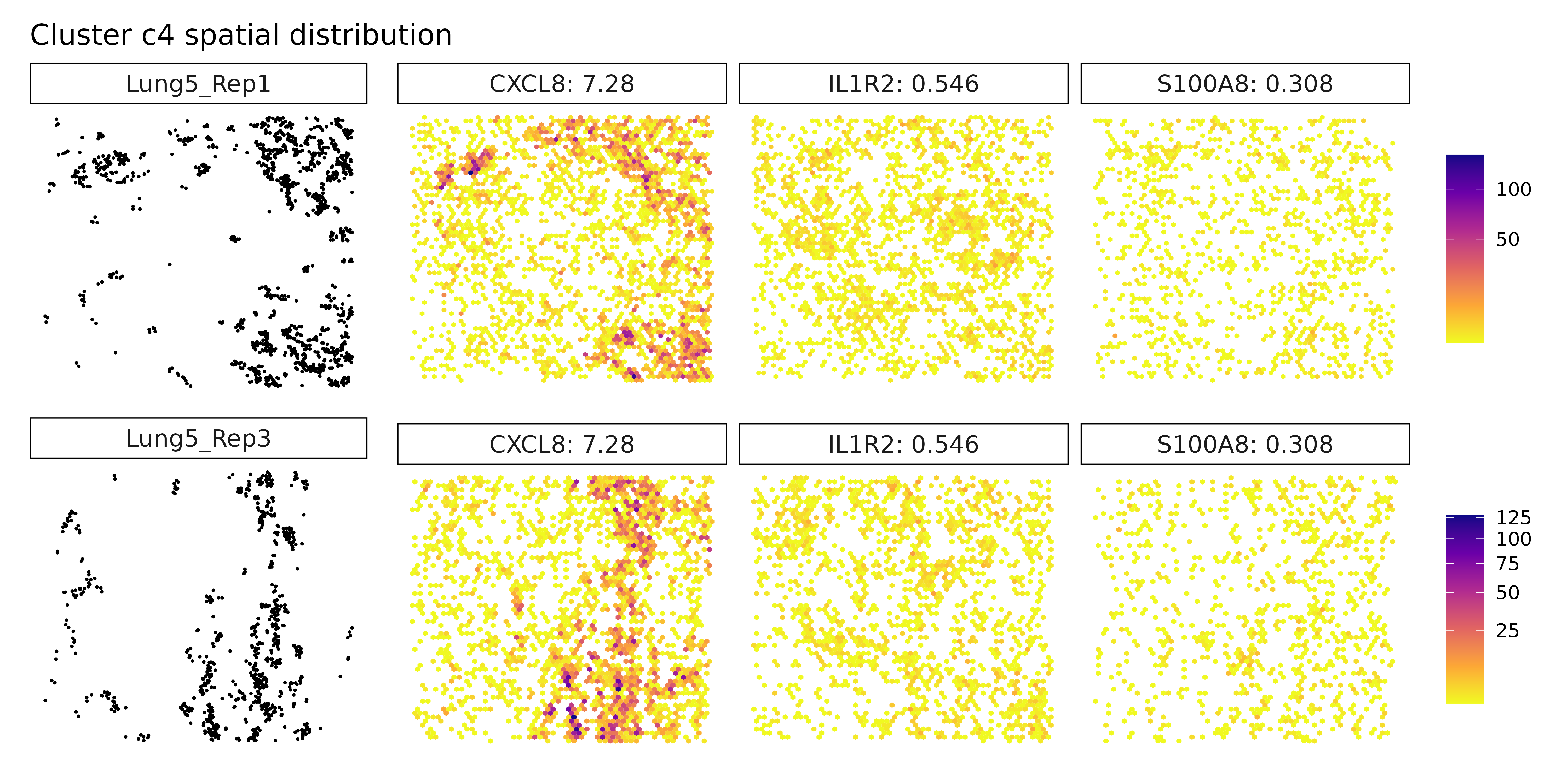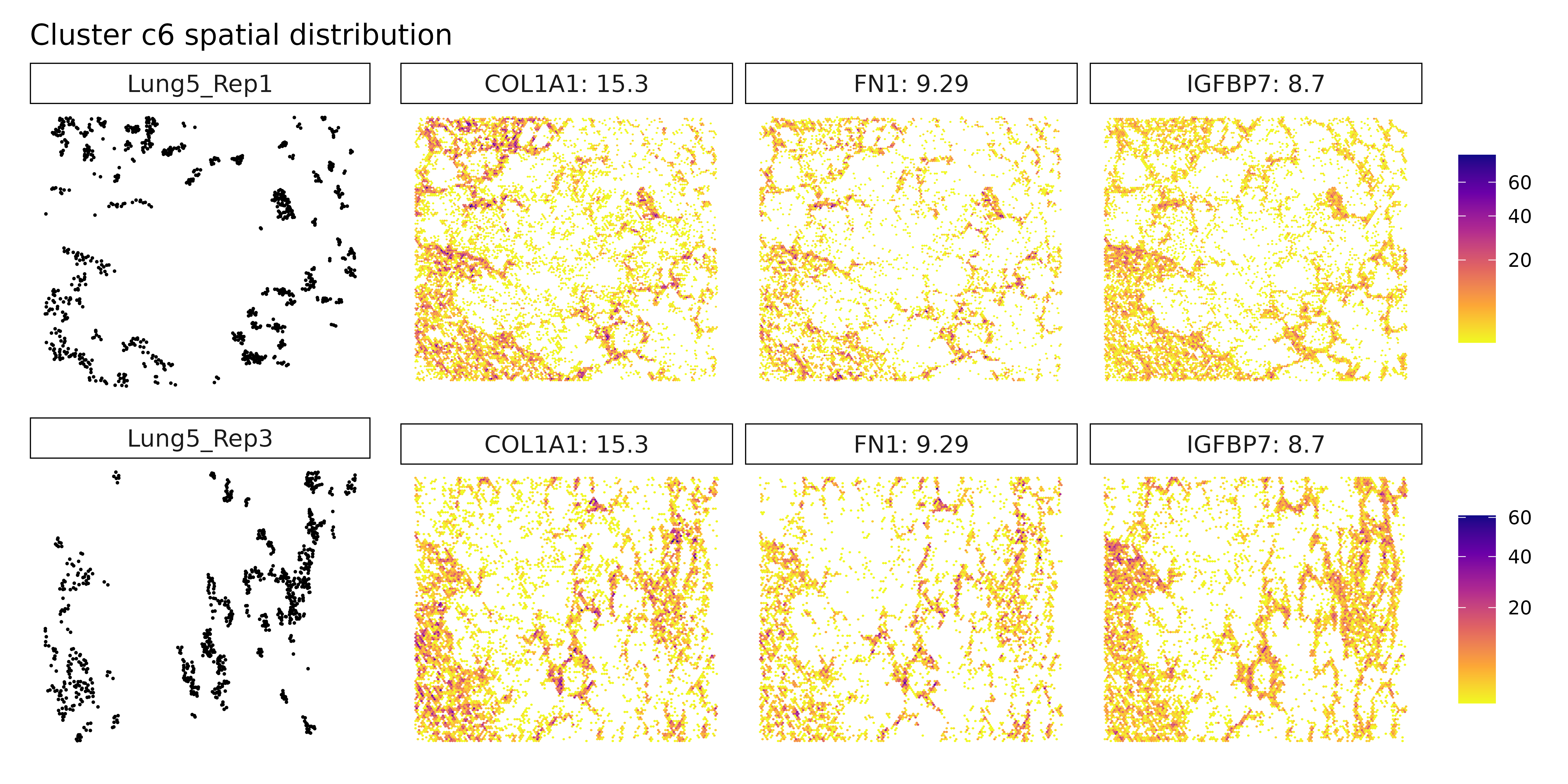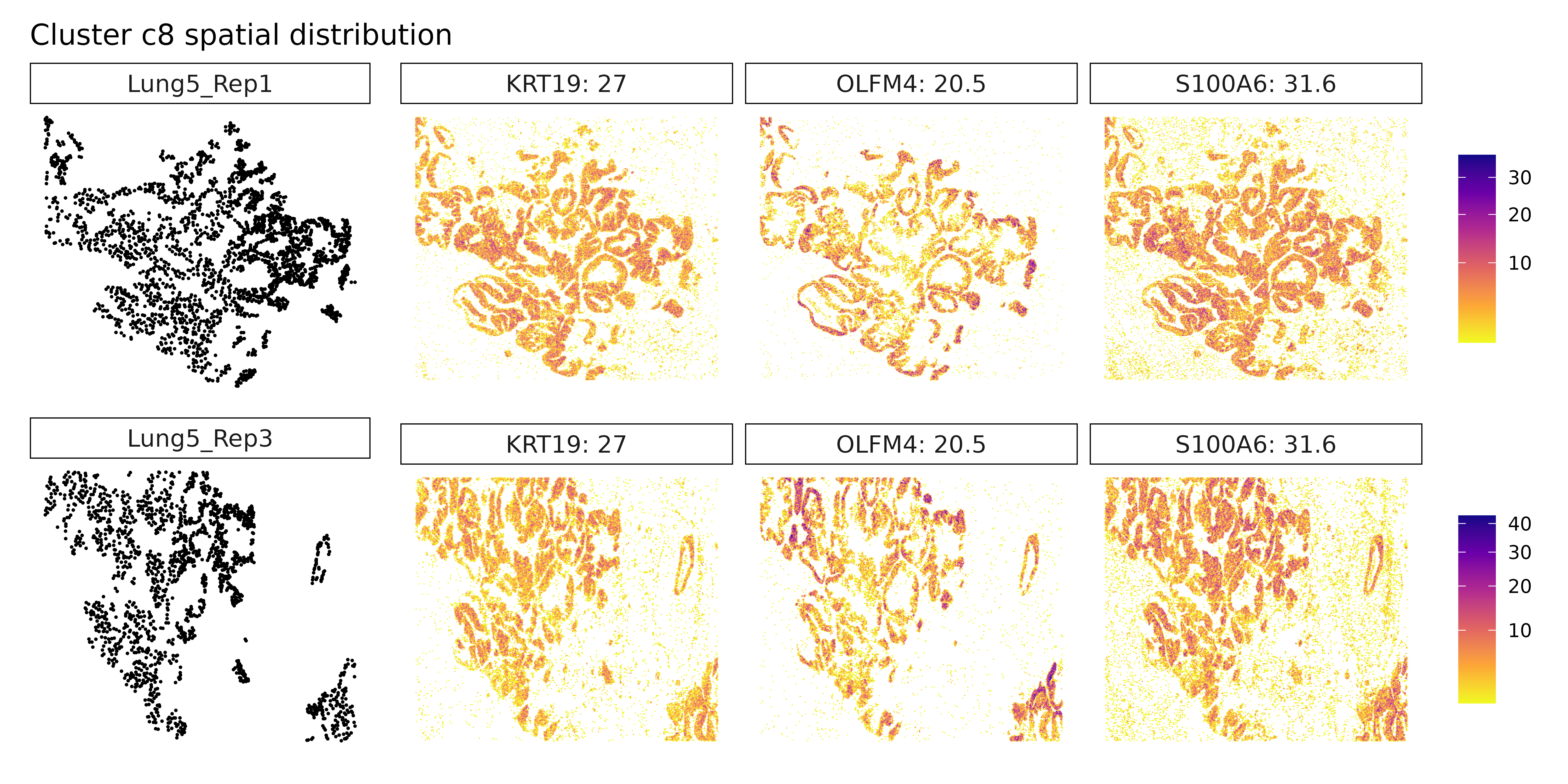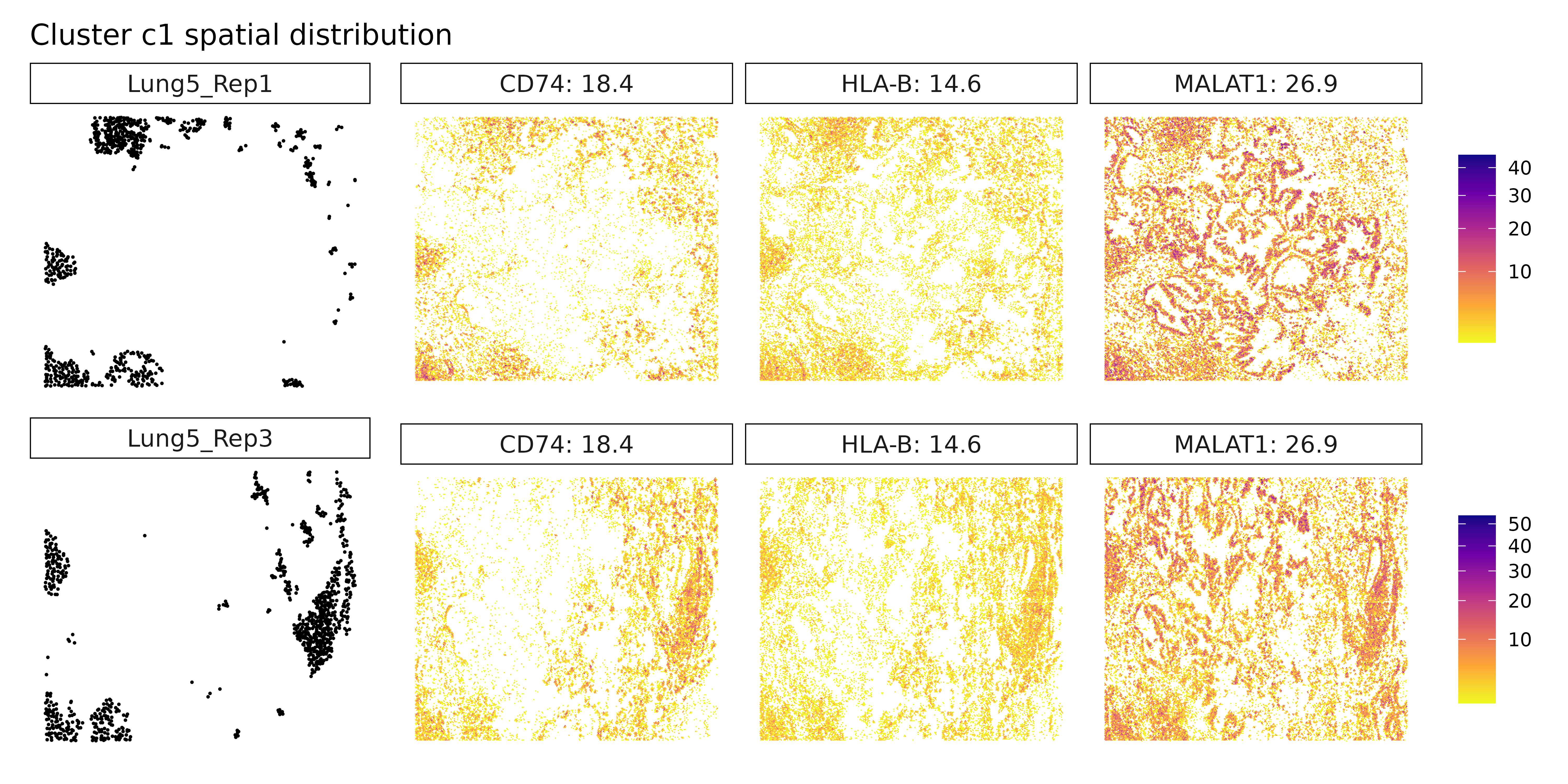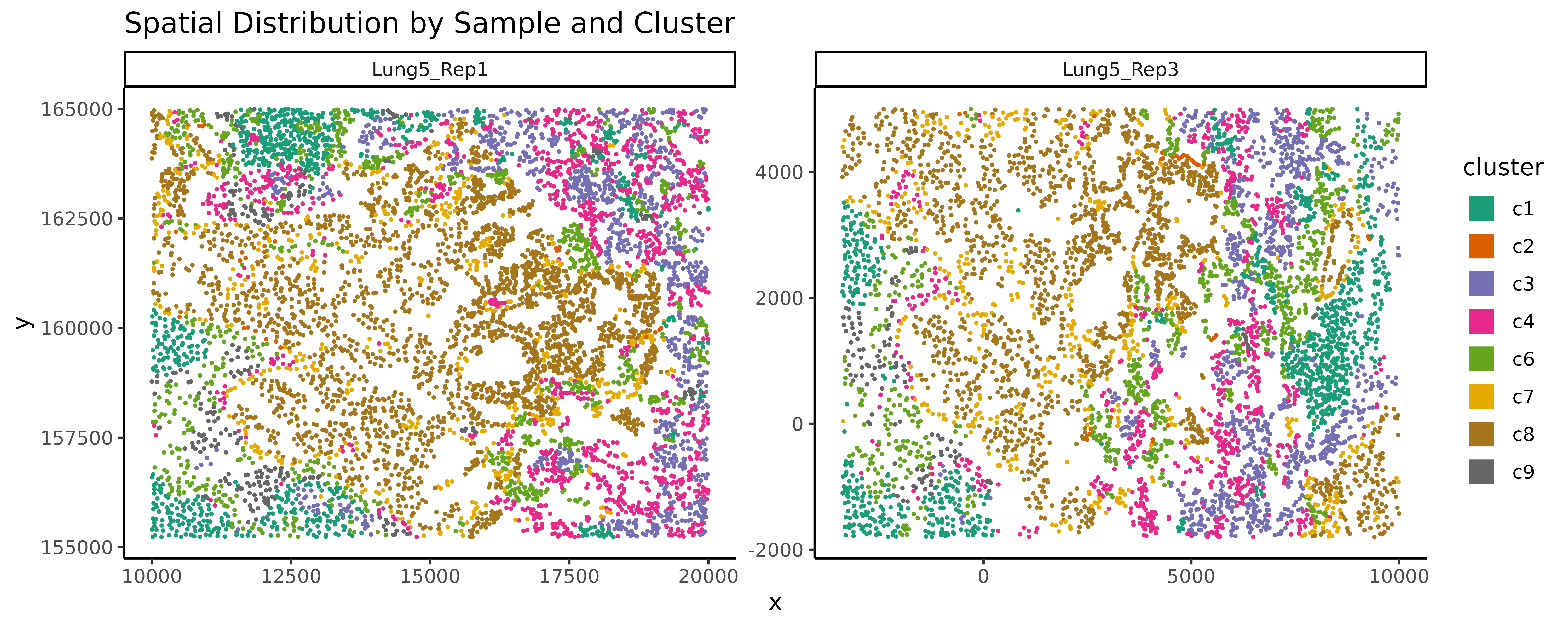 This workshop uses spatial transcriptomics data from lung tissue samples (Lung5_Rep1 and Lung5_Rep3). The data has been preprocessed and subset to specific regions of interest to focus the analysis. The samples contain multiple cell types that have been clustered based on their gene expression profiles, and we’ll use jazzPanda to identify genes that exhibit spatial patterns correlated with these cell type clusters.